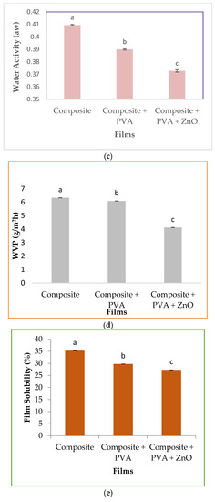 The water activity of the composite film, the composite with PVA film, and the composite with PVA and ZnO nanoparticle film ranged from 0.3727 aw to 0.4094 aw, as shown in Figure 3c. There were significant differences (p < 0.05) between all the samples.