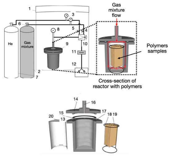 The laboratory equipment of direct gas phase fluorination and oxyfluorination of polymers [26]. (1 is air extractor, 2 is cylinder with a modifier, 3 is corrosion-resistant pressure gauges, 4 and 5 is stainless steel needle valves, 6 is cylinder valves, 7 is cylinder with helium, 8 is corrosion-resistant manovacuummeter, 9 is stainless steel reactor, 10 is shut-off valve, 11 is chemical absorber, 12 is vacuum pump, 13 is housing, 14 is lid, 15 is sealing ring, 16 is fitting, 17 is holes for bolted connection, 18 is wire bracket, 19 is samples of polymers, and 20 is gas mixture flow distributor).