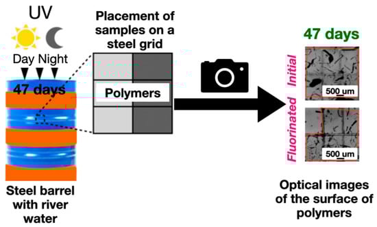 The study of the surface structure of the experimental samples before and after fluorination was carried out using a high-resolution auto-emission scanning electron microscope (JSM-7500 FA (JEOL, Tokyo, Japan)). The corresponding changes in chemical composition were determined using the IR-Fourier spectroscopy technique (FT-801 IR-Fourier spectrometer (Simex, Nizhny, Russia)). The study of the biostability of the experimental samples of algae Rivularia, StigonemaMinutum was carried out for 47 days in a container (steel barrel) under natural sunlight conditions (in the “day-night” mode—at the latitude of Moscow) at a temperature of 30 ± 7 °C. The samples were fixed on a steel grid and placed in a steel barrel filled with river water (Figure 3).