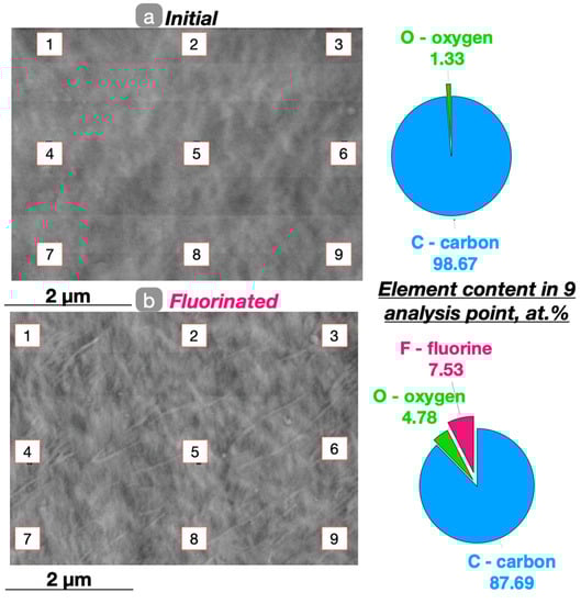 The presence of the fluorine (4.8 ± 0.5 at. %) and the oxygen (7.5 ± 0.8 at. %), as well as the uniformity of their distribution over the surface layer of the modified polymer material are confirmed by the results of point EDS analysis (Figure 7).