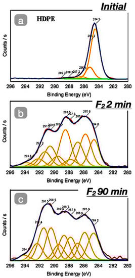Fitted C1s EDS spectra of initial (a) and fluorinated LDPE samples (treatment duration was equal to 2 (b) and 90 (c) min) [29].