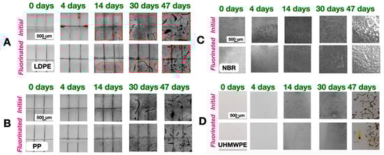 The effect of microalgae on the initial and fluorinated (gas mixture of 15%F2/0.5%O2/82.5%) LDPE (A), PP (B), NBR (C), UHMWPE (D) for 47 days. The red lines show the areas affected by algae.