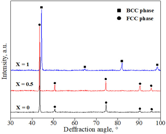 XRD of the FeCoCrNiAlx HEA coatings revealed that FeCoCrNi and FeCoCrNiAl0.5 coatings only contain FCC phase (see Figure 4) judging by prevailing (111), (200), (220), (311), and (222) diffraction peaks. At the same time, the FeCoCrNiAl phase contained only BCC solid solution phase, which contains diffraction peaks (110), (200), (211), and (220). Al atoms dissolve in the matrix, forming solid solutions and expanding the lattice. At small contents, these changes are not affecting the underlying matrix structure [25]. However, at certain threshold contents, Al presence in the host matrix causes enough lattice distortion to cause FCC → BCC phase transition. By comparing the PDF cards, it can be found that the BCC phase has the substitutional solid solution as AlNi, whereas the FCC phase has Al as an interstitial solid solution. The phase transformations of solid solutions in the FeCoCrNiAlx HEA occur due to the high entropy nature of the alloy. Compatibility between components with high mixing entropy increases, which, in turn, prevents the formation of intermetallic compounds in the HEAs. Thus, the formation of simple solid solutions is more energetically favorable [26,27].