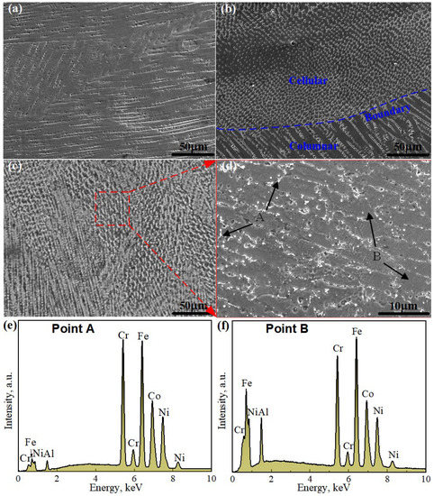 The microstructure of the FeCoCrNi coating was mainly composed of columnar grains (see Figure 5a,b). The microstructure of the FeCoCrNiAl0.5 contained columnar and cellular grains with obvious boundaries. These differences were attributed to the direction of the heat losses dominating during the coating deposition. The direction of the grain growth during solidification is typically opposite to the heat flow current. Thus, solute atoms will gather in front of the solid-liquid interface, which will change the solidification equilibrium temperature. When the actual temperature at the front edge of the solid-liquid interface is lower than the equilibrium temperature, component supercooling occurs at the solid-liquid interface, and cellular grains form. The laser cladding possesses a significantly higher solidification rate than the casting process. Thus, quasi-directional solidification conditions at the solid-liquid interface occur easier, which is conducive to the formation of columnar grains perpendicular to the quasi-directional solidification direction [28,29].