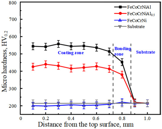 We distinguished three zones with varying hardness (from the top surface of the coating to the substrate): coating zone, bonding zone, and substrate. The hardness in the coating zone is relatively stable throughout the whole sample size. The hardness in the bonding zone decreases substantially due to the dilution of the initially hard coating by the substrate atoms. Additionally, we observed that the hardness in the bonding zone of the FeCoCrNiAl coating decreased more than in the bonding zone of the FeCoCrNiAl0.5 coating (with less Al). This phenomenon can be explained by the induced (by Al presence) Marangoni convection in the molten pool, which, in turn, facilitates the atom exchange at the interface.