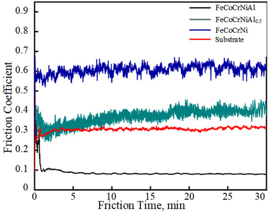 The coefficient of friction (COF) curve of FeCoCrNi HEA coating exhibited periodic fluctuation (see Figure 7) very likely because due to the low hardness of this coating, large abrasive debris and adhesions were continuously generated and removed repeatedly during the wear process (as illustrated in the Figure 8a). This caused a varying contact between the grinding ball and the worn surface, which, in turn, translated into fluctuating COF curve. At the same time, the COF curves of the coatings containing Al were stable.