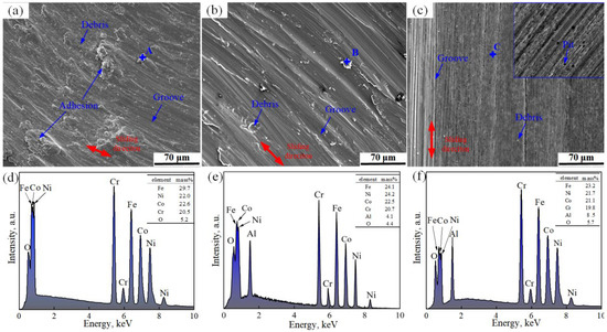SEM images of worn surfaces and elements of the coatings of (a,d) FeCoCrNi, (b,e) FeCoCrNiAl0.5, (c,f) FeCoCrNiAl.