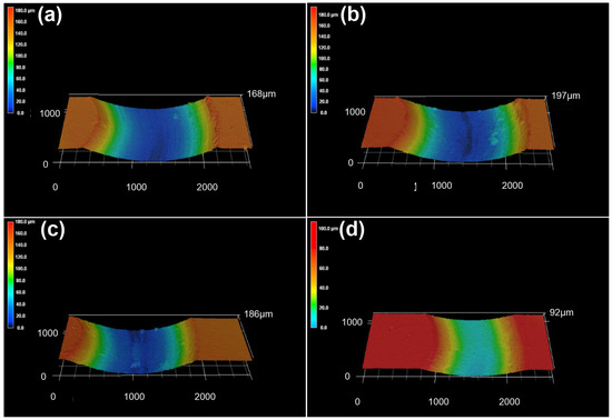 3D morphologies of the worn surfaces of the (a) substrate, (b) FeCoCrNi, (c) FeCoCrNiAl0.5, (d) FeCoCrNiAl.