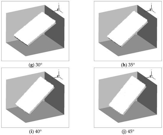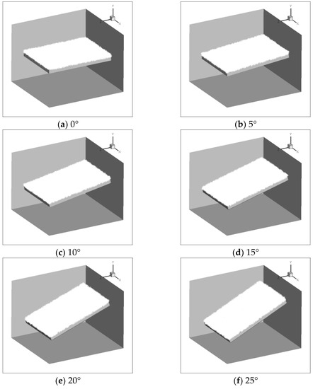 Figure 2 shows the effect of snow at different tilt angles, and Figure 3 shows the relationship between the amount of snow on the surface of a PV module and the tilt angle. According to the number of particles deposited on the photovoltaic module with different tilt angles, the load applied to the photovoltaic module under snowy conditions can be calculated. With each snowflake assigned a weight of 0.1 g, the load change curve of the photovoltaic module in 10 sets of simulated data can be calculated. As suggested by the calculation results, a larger tilt angle of the photovoltaic module leads to a smaller number of snow particles deposited on the photovoltaic panel. The result shows the load applied to the photovoltaic module decreases; this is because the larger the tilt angle, the greater the gravity component of the downward motion of the snow particles. In practice, an increase in the tilt angle is adverse to snow accumulation but conducive to snow removal. The large tilt angle makes it easier for snow to slide quickly on the photovoltaic module. Therefore, in those areas prone to heavy snowfall, the tilt angle can be increased to reduce snow accumulation, which facilitates snow removal.