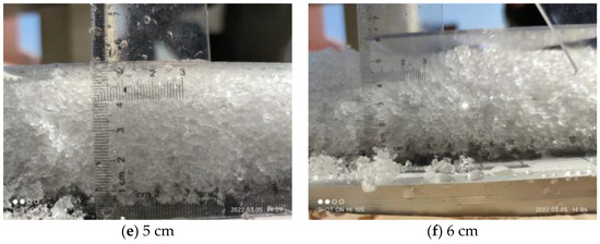 According to the influence of snow thickness on photovoltaic experimental efficiency, it is known that when the snow thickness reaches 1 cm, the photovoltaic-module power generation efficiency decreases to 4%. Therefore, it is considered that the photovoltaic panel cannot work normally under the condition of 1 cm of snow. Therefore, in order to facilitate the experiment and related operations, the snow thickness of the snow slip distance on the power generation efficiency of the photovoltaic module was set to 1 cm. Figure 9 illustrates the experimental process of snow-cover sliding on photovoltaic panels.