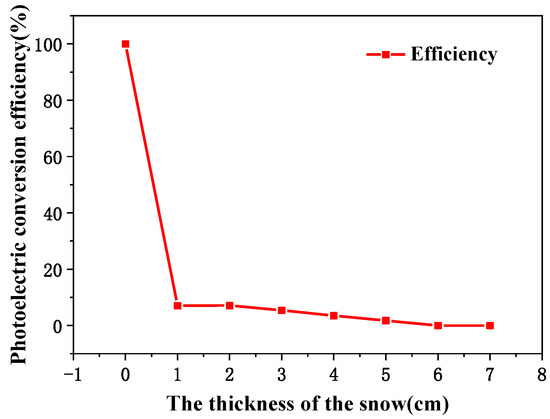 In order to study the effect of snow cover with different thicknesses on the photoelectric conversion efficiency of photovoltaic modules, the photovoltaic panels were placed horizontally outdoors in snowy weather to separately measure the output power of photovoltaic modules with a snow thickness ranging from 1 to 6 cm. Figure 7 shows the layout of the experimental measurement with a snow thickness of 1–6 cm. Figure 8 shows the impact of snow thickness on the efficiency of photovoltaic power generation. When there was no snow, the photoconversion efficiency of the photovoltaic battery was 100%. According to the experimental data, the power generation efficiency of the photovoltaic module reduced to 7.1% at a 1 cm snow thickness. When it increased from 1 cm to 6 cm, the power generation efficiency of the photovoltaic module continued a decreasing trend to zero. When the thickness of snow reached 2 cm and 3 cm, the power generation efficiency of the photovoltaic modules was unchanged, which is attributable to the impact of weather during the experiment or the insufficient accuracy of the solar controller involved. When the thickness of snow ranged between 3 cm and 6 cm, every 1 cm increase of snow thickness reduced the power generation efficiency of photovoltaic modules by about 2%, which basically conforms to a linear reduction. With the increase of snow thickness, the power generation efficiency of photovoltaic modules is sharply reduced, which has a significant impact on the power generation of photovoltaic power stations.