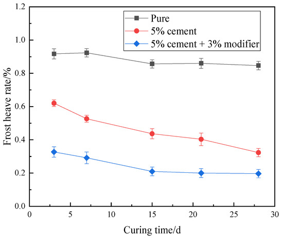 - The double action of the modifier and cement effectively fills the pores between coarse grained soil, forming a strong soil-particle-bonding structure. The frost heave rate of the 5% cement + 3% modifier improved filler under the influence of various test factors is the smallest. After 28 days of curing, the frost heave rate (0.20) is about 1/4 of that of pure filler. After six freeze–thaw cycles, the frost heave rate (0.51) is about 58% lower than that of pure filler, and the frost heave resistance effect is remarkable.