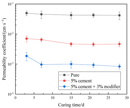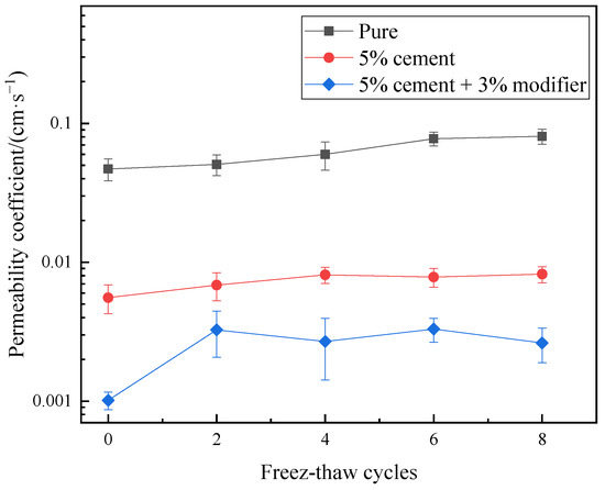 - The modifier promotes the hydration reaction of cement and effectively seals the pores between coarse-grained soil. The permeability coefficient of the 5% cement + 3% modifier improved filler under the influence of various test factors is the lowest. After 28 days of curing, the permeability coefficient (0.0008 cm/s) is about two orders of magnitude lower than that of pure filler. After eight freeze–thaw cycles, its permeability coefficient (0.0026 cm/s) is one order of magnitude lower than that of pure filler, and its anti-permeability performance is the best.