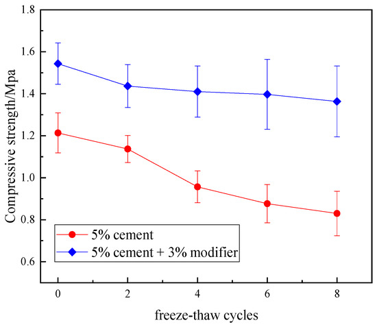 - The hardening condensation reaction of the improved coarse-grained soil generates stable crystalline minerals and forms the strong chemical bond network crystal structure. The compressive strength of the 5% cement + 3% modifier improved filler under the influence of various test factors is the largest. After 28 days of curing, the compressive strength (1.9 MPa) is about 1.3 times higher than 5% cement improved filler. After eight freeze–thaw cycles, its compressive strength (1.36 MPa) is about 1.6 times higher than 5% cement improved filler, and the compressive strength is greatly improved.