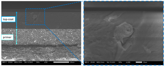 SEM micrograph of the cross-section of coating S, with the enhancement of an olive pit granule embedded inside the top coat.
