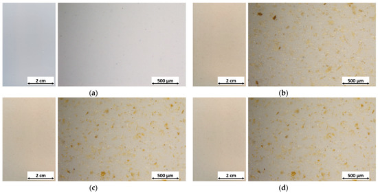 Table 2 exhibits the evolution of the colorimetric coordinates of the four series of samples. The addition of the filler acts on all three colorimetric coordinates. The brightness of the coating is reduced, as the granules cause a decrease in the coordinate L* of about 5–6 points. This is accompanied by a slight growth of the coordinate a* (with a tendency towards red), but above all a clear increase in the value of b*, a symptom of a concrete shift towards yellow tones.