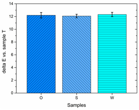 The color change caused by the fillers is easily recognizable, as the average values of E are around 12 for all three samples. As a color change with an E value of 1 is defined in the literature as being perceptible even to the human eye [62,63], the samples O, S, and W appear very different from the coating T, as stressed in Figure 3. In addition to the mean value of ΔE, the error bars are also very similar between the three samples containing the filler, proving that the functionalization process does not affect the appearance of the granules.