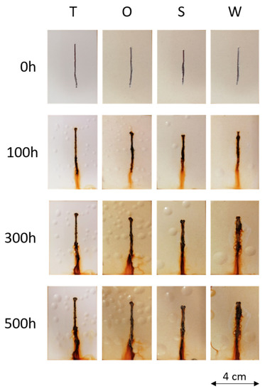 Sample T shows a very rapid development of blisters, as a symptom of a limited barrier effect of the waterborne paint. After 100 h, no new blisters rise, but the already existing ones continue to grow in size, covering more and more surface area of the sample. The untreated olive pit powder (sample O) causes an exacerbation of this phenomenon, with a greater number of blisters and area conditioned by the defects. Furthermore, the decrease in blisters observed after 200 h is due to the union of several bulges that come into contact, to form large protuberances, even up to 5000 µm. This phenomenon had already been observed in the previous work [43] and is mainly due to the hydrophilic lignocellulose nature of the olive pit [41,44,45], which promotes undesired water uptake occurrences [65,66]. With the aim of masking the hydrophilic characteristic of the filler, the powders were functionalized with silanes and wax. Indeed, the silane seems to considerably improve the behavior of the granules (sample S). The blisters increase in size over time but are very limited in number. Therefore, the defectiveness of the coating is greatly limited by the functionalized filler, which even improves the barrier effect of the polyurethane matrix. On the other hand, the wax (sample W) involves a reduction in the number of blisters compared to the filler-free coating (sample T), but they still increase considerably in size. Furthermore, during the test, several blisters develop at the notch, representing an ineffective barrier, such as that evidenced by the silane-treated powders.