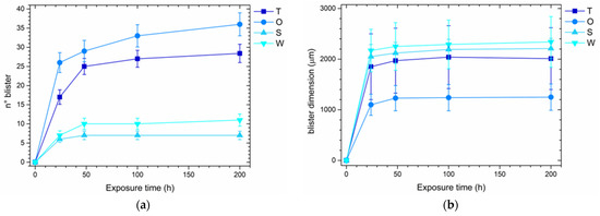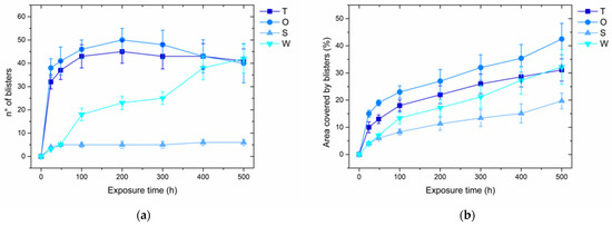 Again, the performance of these three samples is distinguished by the hydrophilic/hydrophobic characteristics of the bio-based filler they contain. UV radiation was alternated with condensed vapor exposure cycles in order to observe possible water uptake phenomena facilitated by the physical-chemical degradation of the polymer matrix and fillers. The result of these phenomena is highlighted in Figure 12, which reveals the evolution of the number and dimension of blisters in the samples (Figure 12a and Figure 12b, respectively) during the test.