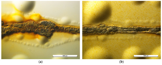 Throughout the first 100 h of exposure in the salt spray chamber, the samples were checked every 24 h. Until the test’s conclusion, the samples were checked every 100 h. An artificial notch with a width of 1 mm was produced on the surface of the coatings with the intention of inducing the development of corrosive phenomena at the substrate–coating interface. During the monitoring of the behavior of the samples, both the blister evolution phenomena and the coating delamination processes at the notch were considered [64].