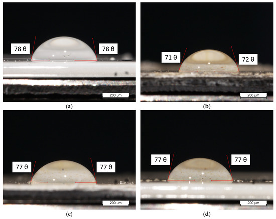 In order to evaluate the effect of the filler on the surface wettability of the coatings, contact angle measurements were performed following the ASTM D7334/08 [53] standard. A Nikon 60 mm lens f/2.8 for macro pictures was used, and the wetting angle was measured by using the NIS-Elements Microscope Imaging software (Windows Version). The drops were formed with a syringe and dropped from a height of about 2 cm. Once the drop was focused the picture was captured, the wetting angle was measured by means of the imaging software. In total, 10 measurements were performed for each sample to obtain statistical validity.