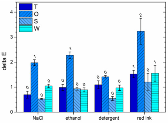 Coatings color changes of the samples after contact with liquids. The numbers above the columns are representative of the levels in Table 4.