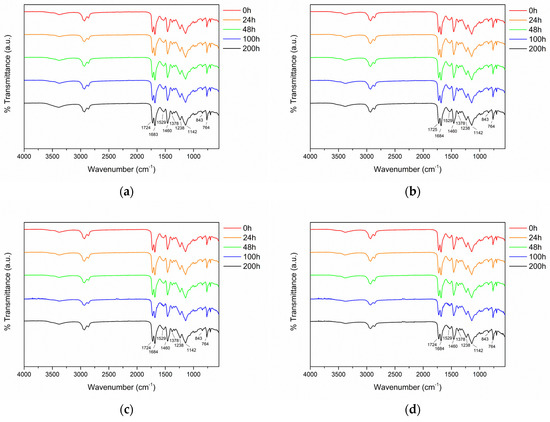 Evolution of the FTIR spectra of (a) sample T, (b) sample O, (c) sample S, and (d) sample W, during the exposure to UV-B radiation.