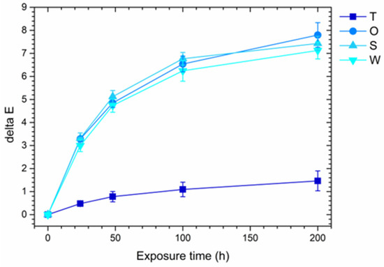 However, the colorimetric inspections of Figure 11 reveal a high color change ΔE of these three samples during exposure to UV-B radiation. While the polymeric matrix (sample T) did not undergo considerable alterations, the lignin-based fillers show a rapid color change, which causes the concrete modification of the appearance of the three coatings O, S, and W. After all, the photo-oxidation occurrence of the wooden material, which constitutes the olive pit filler, was predictable [43]. The functionalization process with silane or wax does not alter this degradation process of the filler, and consequently, it is not possible to appreciate a difference in behavior between the three samples O, S, and W.