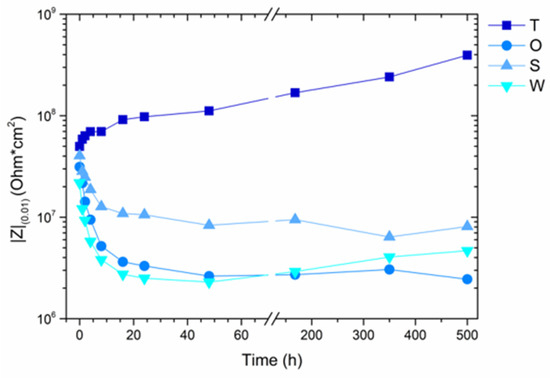 Thus, the protective behavior of the four series of coatings was evaluated by recording the development of their impedance module|Z|(0.01) over time. Figure 14 depicts the change in the parameter |Z|(0.01) over the course of the samples’ 500-hour exposure to the test solution. Since all four samples show |Z|(0.01) values that never fall below the threshold limit of 106 Ω·cm2, the test result suggests that the coatings of the four series provide adequate protection to the steel substrate. In confirmation of the previous results, the powders functionalized with silane of sample S seem to offer greater protective guarantees than the other types of fillers (samples O and W). However, the graph shows an unexpected trend: while the three coatings containing the fillers show a decrease of |Z|(0.01) over time, typical of an organic layer, the sample T exhibits an increase of the impedance modulus during the measurements. This result does not represent a better protective feature of the pure polyurethane matrix of the coating T, but rather suggests that the layer has poor adhesion, and the penetration of test solution into the polymeric matrix favors bulging phenomena. The tendency for solution absorption and the resultant production of corrosion products increases the resistive effect of the system. This phenomenon falsifies the result of the EIS measurements but highlights a poor protection of the coating when in contact with an aggressive solution.