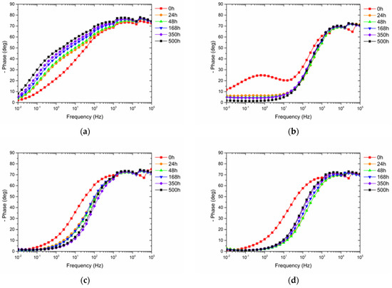 Finally, the protective features of the composite coatings were studied by means of Electrochemical Impedance Spectroscopy (EIS) measurements, carried out with a potentiostat Parstat 2273 (Princeton Applied Research by AMETEK, Oak Ridge, TN, USA) with the software PowerSuit ZSimpWin (version 2.40) and applying a signal of about 15 mV (peak-to-peak) amplitude in the 105-10-2 Hz frequency range. The cell setup was composed of an Ag/AgCl reference electrode (+207 mV SHE) and a platinum counter electrode, immersed in the 3.5 wt.% sodium chloride solution. The samples were kept immersed in the test solution for a total of 500 h, with a testing area equal to 6.5 cm2. The measurements were carried out on five samples per series.