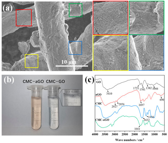 (a) SEM of CMC-aGO (Colored blocks on the right are local magnifications); (b) Photo of CMC-aGO and CMC-GO; (c) FT-IR of GO, aGO, CMC, and CMC-aGO.