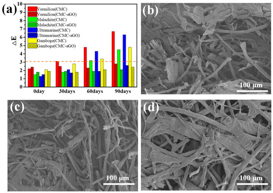 (a) Color difference of four pigments treated with CMC and CMC-aGO after UV aging. SEM of (b) The blank group, (c) CMC, and (d) CMC-aGO-treated paper after UV aging.
