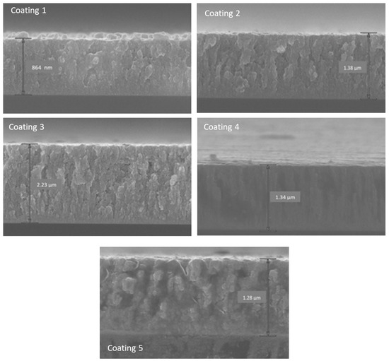 The chemical composition of the deposited films was obtained by Energy Dispersive X-ray Spectroscopy (EDX) and quantified by Quantax Esprit software [20]. For each sample, the measurement was carried out on multiple zones of the sample. The elemental spectra and maps were acquired from SEM images by applying a high accelerating voltage of 15 kV and a pressure vacuum of 10−4 Pa, considering: a 60 kcps count mode, a 40 keV acquisition range and a 2 kcps initial counting rate. The coating cross-section images were obtained using a Hitachi SU8030 scanning electron microscope (SEM).