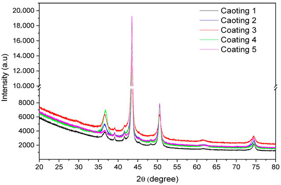 The crystallinity of the prepared thin films was carried out using the XRD technique. Figure 3 presents the diffractograms of the five sputtered thin films. The films present peaks at the same scattering angles (2θ) corresponding to copper and copper oxide (Cu2O). The Cu peaks at 2θ values of 43.28°, 50.40° and 74.81° correspond to the (111), (200) and (220) planes, respectively. The Cu2O peak at 2θ value of 36.4° corresponds to the (111) plane. All diffraction peaks agree with the standard patterns for the pure face-centered cubic phase of copper (JCPDS No. 040836 and COD-4313211) and Cu2O (JCPDS No. 050667 and COD-1010941). The peaks also present quasi-similar intensities, reflecting that the adopted preparation methods did not affect the crystalline structures of the five sputtered coatings, although the oxygen contents differed. Thus, the atomic arrangement of the sputtered thin layers and the interatomic distances led to a similar number of scatters per unit area of the atomic plane present in these thin layers [27]. The crystallite size was calculated considering the Cu (111) peak at the 2θ value of 43.28° presenting the highest intensity and the main crystalline phase. Table 5 shows the crystallite size from the different sputtered thin films.