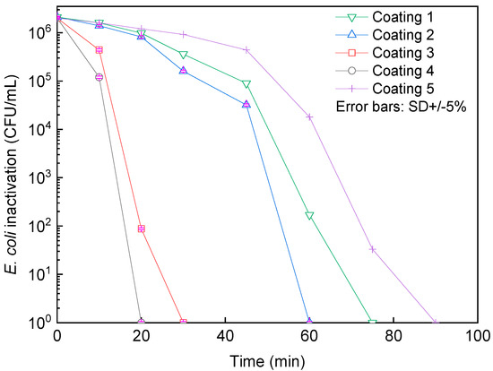 The bacterial inactivation efficiency was tested for the five prepared coatings. Figure 4 shows that fast bacterial inactivation was obtained using coating 4. As seen in Table 1, this film was prepared using the highest oxygen amount (10 sccm) and a deposition length of 35 min. From Figure 2, this thin film is 1.34 µm thick. Coating 3 is another sample that exhibited high bacterial inactivation kinetics. The slowest bacterial inactivation was seen to happen at the interface of sample 5.