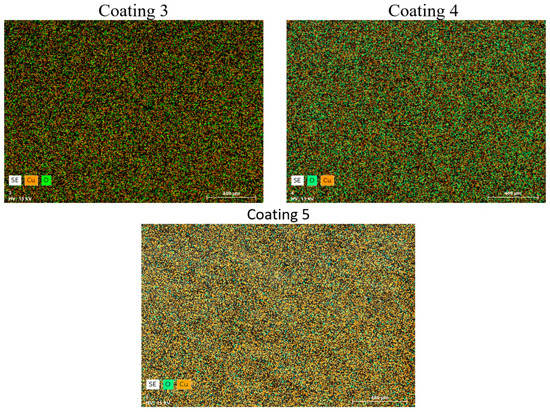 To understand the bacterial inactivation behavior in Figure 4, the distributions of copper and oxygen atoms in the sputtered thin films were mapped by using the EDX technique, and these are shown in Figure 5 for coating 3, coating 4 and coating 5. Coatings 1 and 2 were not imaged because their bacterial inactivation kinetics were not that fast, and coating 5 was imaged for comparison purposes. It can be noticed that there is a homogeneous distribution of Cu and O along the three different coatings. Coating 3 presents 83.5% copper and 16.5% oxygen, coating 4 presents a higher oxygen content (25.8%), while coating 5 presents a lower amount (7.8%), which justifies the yellowish appearance shown in Figure 5.