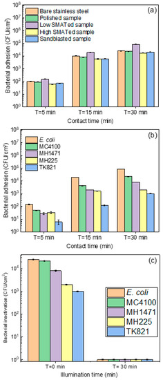 (a). Wild E. coli adsorption at the interface of bare stainless steel, polished stainless steel, low-energy SMAT stainless steel, high-energy SMAT stainless steel, and sandblasting stainless steel. (b). Different E. coli strains adsorption on low-energy SMAT stainless steel. (c). Inactivation of different strains of E. coli at the interface of low-energy SMAT stainless steel under indoor light for 30 min.