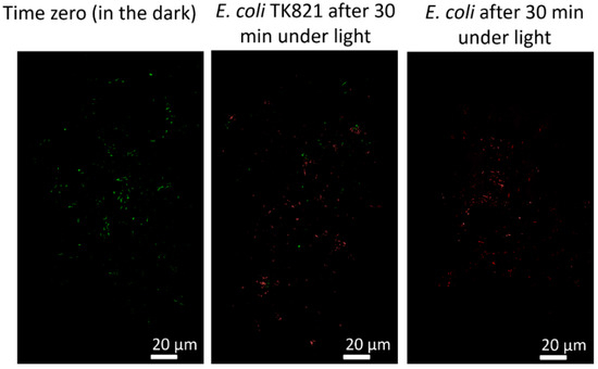 Figure 7 shows the live/dead E. coli cells at the interface of low-energy SMAT stainless steel coated with a copper oxide sputtered layer. The green dots represent the live cells, and the red dots represent the dead cells. As it can be seen from Figure 7, the live bacteria were seen within the first 30 min in the dark, allowing adhesion to the surface and confirming the results shown in Figure 6a. After 30 min of illumination, all the adhered cells were practically dead for the wild E. coli strain. Concerning the TK821 strain, after illumination, very few (insignificant) cells were alive (in the green color) at the interface of the low-energy SMAT sample. As these bacteria did not appear when we performed the plate count agar method, they can be viable, non-cultivable cells. This means that these bacteria underwent enough cell wall injuries that did not allow them to replicate and form colonies [26,35].