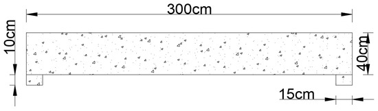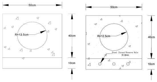 A total of 4 test beams, numbered L0–L3, were formed in this test. The control beam L0 was not strengthened, and the test beams L1–L3 were toughened in different ways. The length, width and height of the test beams were 300, 50 and 40 cm, respectively. Circular channels with a diameter of 25 cm were arranged in the cross section of the hollow slab beam. Hollow slab beams at both ends of the pouring support measured a support size length, width, and height of 50, 15, and 10 cm, respectively; in the test beams L0–L3, reserved tension channels were supported for the insertion of steel strands. The specific test beam sizes are shown in Figure 2 and Figure 3.
