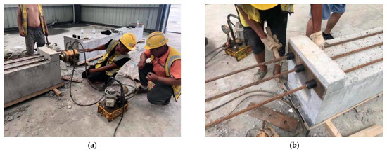 In total, 12 steel strands of 4 m length were cut. One end of the reserved channel was anchored with a single anchor head, and the other end was laid with an anchor plate and tensioning jack. The tensioning stress was controlled through the tensioning stress table and elongation. See Figure 5 for tension and anchorage of the steel strands.