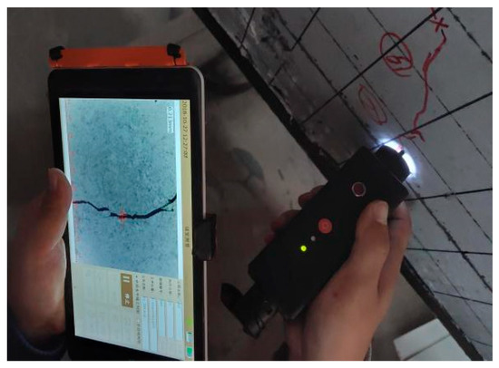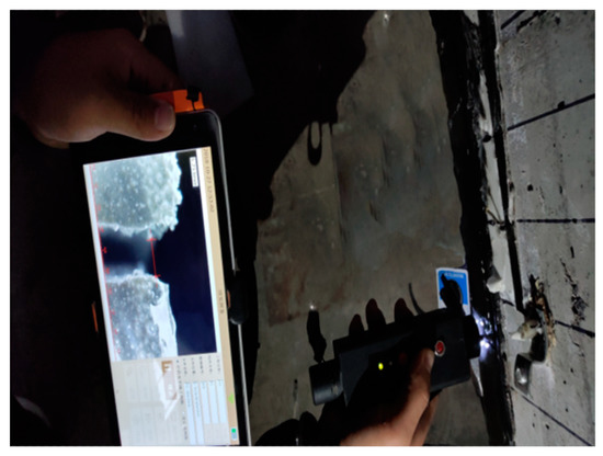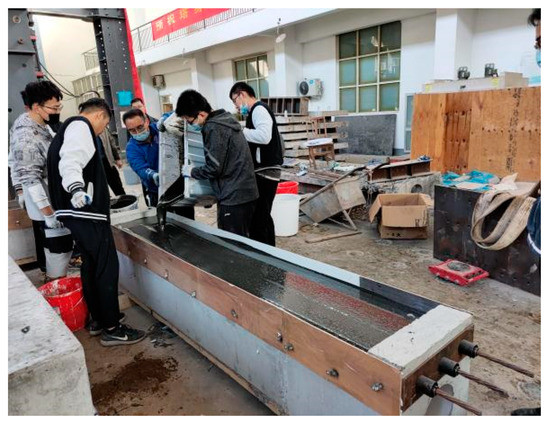 The toughening material was weighed and mixed according to the ratio and then poured into the mixing bucket for full stirring with a hand-held agitator. After the materials were mixed evenly, the mixture was poured directly onto the beam surface. Due to the fast condensation of the reinforcement material, it was stirred continuously in the process of mixing and pouring to prevent consolidation of the material. After demolding and curing at 20 °C for 14 days, flexural capacity testing of the hollow slab beam was carried out. The site pouring and loading are shown in Figure 6 and Figure 7.