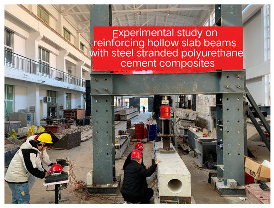 With the rapid growth of traffic volume in China, the vehicle transport load continuously increases. Due to the effects of rain, snow, weathering and other natural conditions, a large number of bridges built at various times in the past have appeared to gradually deteriorate and erode [1,2,3,4]. In particular, the prefabricated concrete hollow slab beams put into operation at the end of the 20th century suffer from these conditions [5,6], affecting the normal passage of the road and causing huge economic losses. Although existing reinforcement methods [7,8,9,10,11,12,13] could effectively improve the bearing capacity of old bridges, there are still some limitations in controlling the self-weight of the structure, shortening the reinforcement period and simplifying the reinforcement process. In recent years, polyurethane cement composite, a lightweight and high strength corrosion resistant material [14,15,16,17], has become a hot research topic in the field of bridge reinforcement.