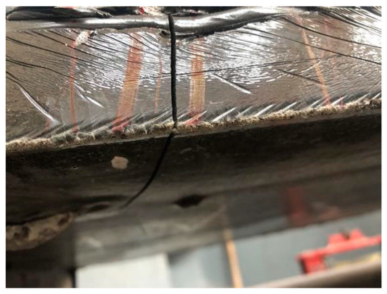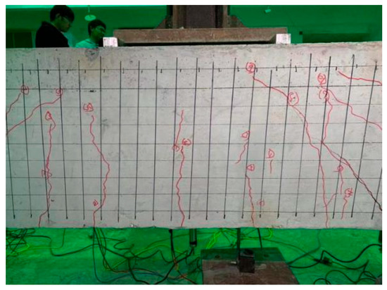 During loading, cracks appeared in all beams, and multiple cracks appeared with the acceleration of deflection growth, rapid crack extension, and crack spread to the top of the beams. Before cracks appeared in L1–L3 reinforced beams, the deflection and strain increased regularly with the increase in load. The deflection of the midspan section increased weakly, and the strain changes at different heights of beams were not obvious. When the crack spread to the top of the beam, it was accompanied by the fracture of the polyurethane-reinforced material. The concentrated forces, corresponding to the midspan sections of L0 and L1–L3 of the reinforced beam at each state, are shown in Table 5. The cracks and fractures of each beam are shown in Figure 8, Figure 9, Figure 10 and Figure 11.