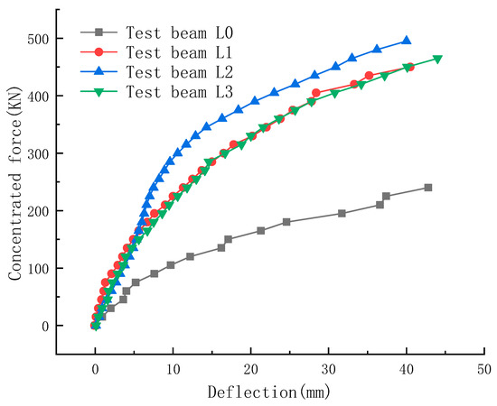 The whole process of stressing and deformation of the test beams L0–L3 under load was experienced as follows: no cracks in the concrete, initial crack appearance and development, and finally, failure. When there was no crack in the test beam, the applied concentrated force was lower than the cracking load, the load–deflection curve was basically linear, and the test beam was in the state of elastic force. After cracking, the slope of the load–deflection curve gradually decreased, showing a nonlinear trend. When the bending moment reached a certain value under the load, the deformation of the beam was limited under the constraint of the steel strand, and the crack width and deflection of the test beam increased slowly with the increase in the load. When the test beam was damaged, the deflection increased rapidly, the cracks developed rapidly and spread above the neutral axis, the concrete compressive strain at the edge of the compression zone reached the ultimate compressive strain, the concrete was crushed, the reinforcement layer broke, and the beam side in the middle of the span appeared through cracks. The load–deflection curve is shown in Figure 12.