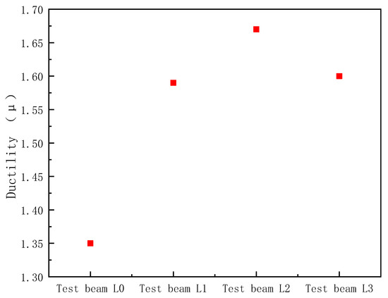 The displacement ductility coefficient μ was calculated by the ratio of the mid-span ultimate deflection δu of the test beam to the yield deflection δy. The results of the ductility of the test beams L0–L3 are shown in Table 6, and the scatter distributions of the ductility of each test beam are shown in Figure 13.