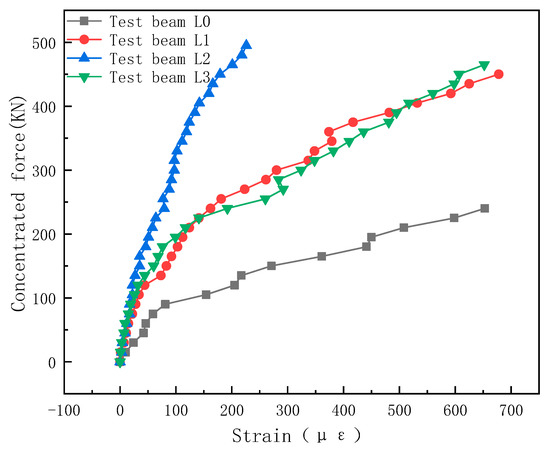 - According to the high strain diagram along the beam of each test beam, it was noted that the high strain along the beam of test beams L0, L1, L2 and L3 under load conformed to the assumption of the plane section when the test beam was under elastic stress, elastic–plastic stress and failure stage;