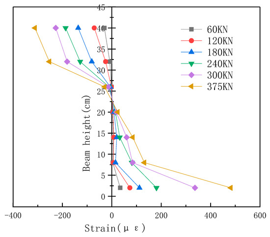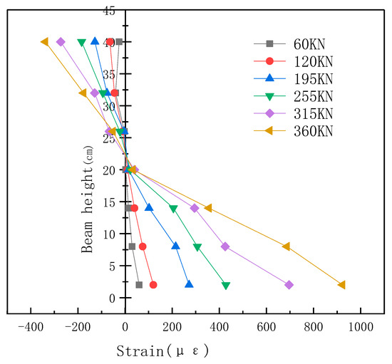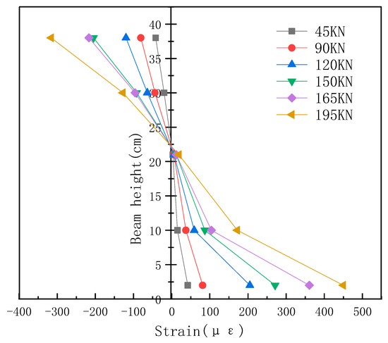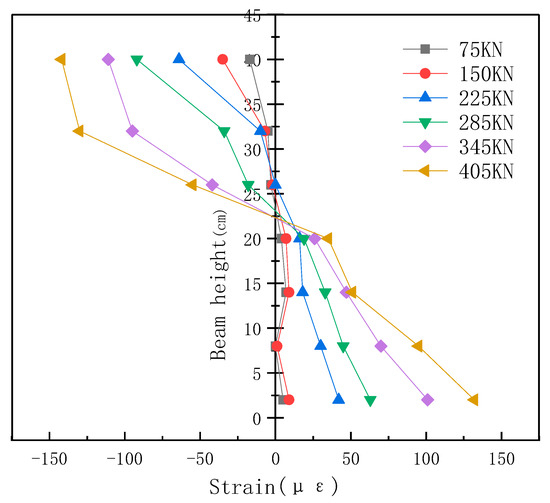 Through the flexural capacity test of the normal section of the test beam, the concentrated force was applied incrementally in the middle of the span. The concrete strain values of different sections of the beam height under different loads were obtained using the static strain collection instrument, and a distribution map of the measured average strain was drawn. As shown in Figure 15, Figure 16, Figure 17 and Figure 18, when the test beam was in the elastic stress stage, there was no damage to the concrete beam, and the neutral axis of the section gradually moved to the compression zone as the load increased. At this time, the applied load was small, the concrete below the neutral axis was under tensile stress, and the concrete above the neutral axis was under compressive stress. At this time, the strain was an inclined straight line, and the strain distribution along the high section of the beam under the load was a triangle, with the top and bottom opposite. The concrete test beam at this stage fully conformed to the assumption of the plane section. When the test beams in the elastic–plastic stress test (L1–L3) reached the cracking load, below the neutral axis of the concrete cracks, reinforcement with the surrounding concrete occurred, producing relative displacement. However, at this stage, the prestressed steel hinge line and polyurethane cement composite began to undertake the main external load, offsetting part of the tensile stress. Under the action of load, the strain distribution along the high section of the beam was approximately triangular from top to top, and the average strain distribution of other sections of the beam across the crack was still consistent with the assumption of plane section. When the test beam was in the failure stage, the crack width in the tensile zone of the test beams L0–L3 increased sharply and the steel bar yield in the tensile zone occurred in a finite length range. The concrete in the compression zone was crushed within a certain length range, and the polyurethane cement composite did not peel or fracture. The section deformation at this stage was still approximately consistent with the assumption of the plane section.