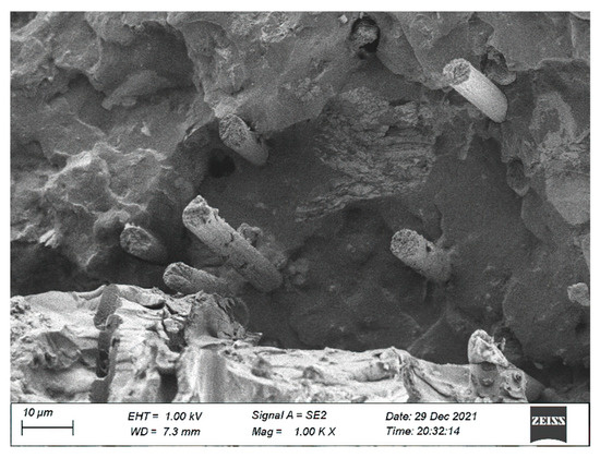 The good adhesion of polyurethane cement composite could be clearly observed by SEM. There was no gap or crack between the fiber and the polyurethane cement composite, as shown in the figures below. As shown in Figure 19 and Figure 20. It can be seen that the fiber played a positive reinforcement role [14].
