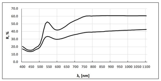 The spectral reflection curves in the operating range of 250–1100 nm, i.e., in the visible and near-IR spectrum ranges, were recorded using a Lambda spectrophotometer (company PerkinElmer Ltd. Chalfont Road Seer Green Beaconsfield BUCKS HP9 2FX, Seer Green, UK) equipped with a 150 mm Integrating sphere). During the measurements of the spectral values, light is collected by an integrating sphere, registered, processed, and displayed by the UV WinLab software V6.0.4.