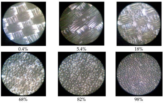 Figure 6 shows images of the samples that clearly show the difference in the GMB consumption per unit area of fabric. The authors show that the maximum retro-reflective effect is produced when 80–98% of the fabric surface is covered with micro glass beads.